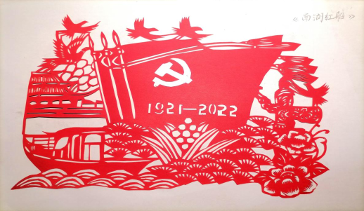 作品介绍:纸的世界,不仅是空白的平面,或镂空,或多彩的形态不仅传达着艺术美学,更表达了我们担当民族复兴大任的决心。通过前期了解并创作《南湖红船》剪纸,能让学生更深刻的意识到强国复兴的重要性,并为此开拓奋进,勇往直前。