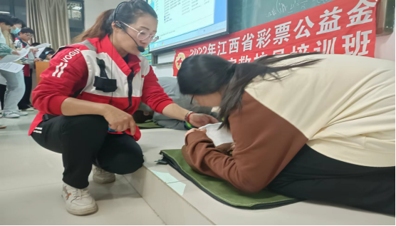 授课老师通过现场模拟救助场景示范急救方法,现场指导学员进行练习,直至每位学员都掌握心肺复苏CPR+AED的使用、外伤应急处理、海姆立克急救法等技术要点和操作手法。最后,授课老师对每位培训学员逐一考核,考核通过的学员可获得江西省红十字会颁发的初级救护员证书。