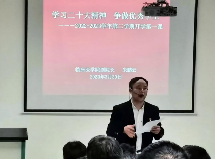 课堂上,朱鹏云副院长从党的二十大主题开始,分15部分进行了深入浅出的讲授,系统地阐述了以中国式现代化全面推进中华民族伟大复兴的壮阔图景,教育引领新时代医学生应领会党的二十大精神深刻含义,增强医学生使命感责任感。同时立足新葡的京集团8814vip工作实际,对学院的前景做出了期望,并呼吁新时代医学生应当笃行实干,以奋发有为的精神状态和只争朝夕的奋斗姿态踔力奋达,切实担负新时代赋予的重任,在新赛场上跑出好成绩,创造新辉煌。