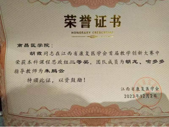 近日,由江西省康复医学会主办,江西省康复医学会康复治疗教育专业委员会承办的“江西省康复医学会首届教学创新比赛”落下帷幕,学院康复治疗医学教研室教师团队胡霞、胡龙、喻多多(指导教师:朱鹏云)在大赛中荣获本科课程思政组二等奖。