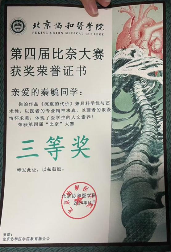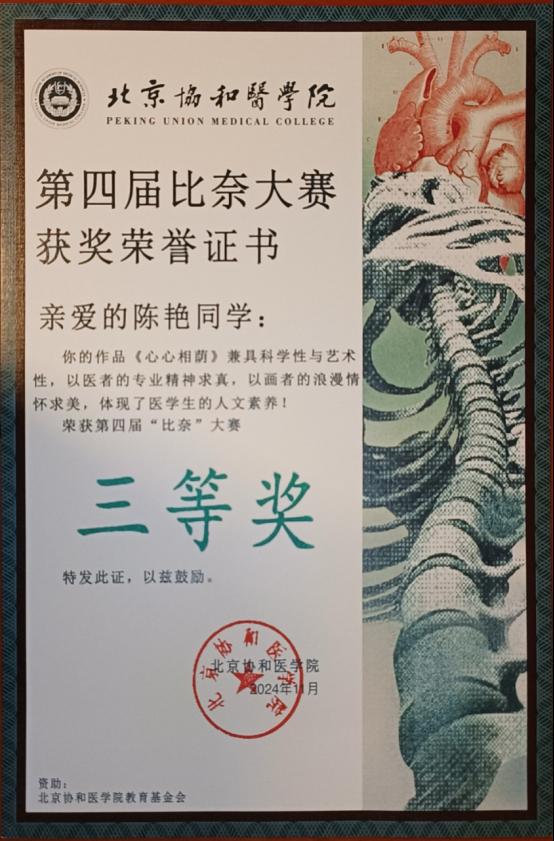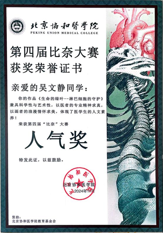 沉着冷静,以医者的专业精神求真、以画者的浪漫情怀求美,夺得两个三等奖。参与网民投票环节的吴文静同学的《淋巴细胞的守护》则荣获本次比赛网络人气奖。