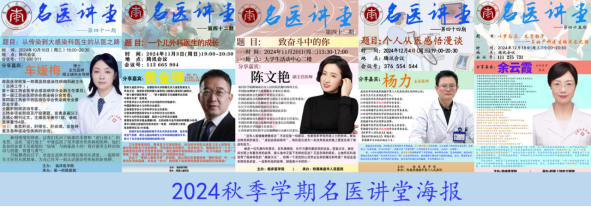 名医讲堂是深化院校融合,提升临床医学专业内涵的重要抓手,项目的运作在提升临床医学专业学生对专业的认知和对临床医生职业的理解中,发挥着越来越重要作用。在总结前4个学期运作经验的基础上,2024秋季学期统筹安排了5期高质量的分享。12月18日晚,随着分享嘉宾余云霞教授在回答学生提问时说到“找到自己的兴趣,热爱可抵岁月漫长,谢谢”,2024秋季学期名医讲堂正式落下帷幕。