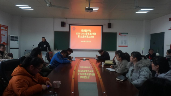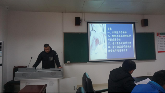 吴主任发表讲话,他对本学期教学相关重点及一般工作进行了安排,并向我们展示了2021年我校执业助理医师考试成绩分析。吴主任表示虽然我校执业助理医师考试通过率高于全国平均水平也高于江西省同类型高校,但环比往年成绩有所下降,同比其他学校我们的付出与回报不成正比,希望我校2022年执业助理医师考试能取得更好的成绩。最后吴主任带领我们学习了教务处相关教学文件及新葡的京集团8814vip课堂教学质量评价表。