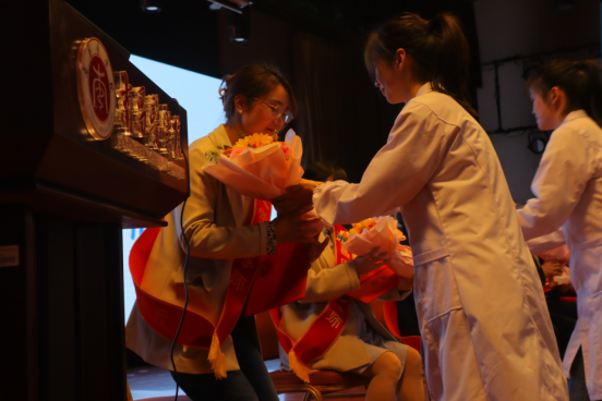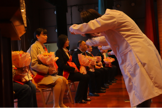 为突出导师制的庄重,学院不仅为导师们颁发了聘书、为他们佩戴了喜庆的绶带,同时还创造性地设计了较为正式的拜师礼环节,旨在让导师与学生达成一份心灵的契约,让彼此的心理联结更近一些,心近了,学习之途就不再遥远。伴随着“感恩的心”背景音乐,8位优秀的学生代表依次登台向8位导师代表敬献鲜花,作揖并行鞠躬礼,台下响起了雷鸣般掌声。目睹这一幕,在场的每一个人都为之动容,这就是尊师重道本应有的样子,真好!